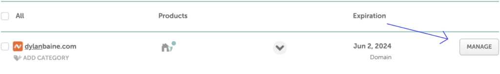 Once you find your domain in this page, you want to click the “Manage” button: