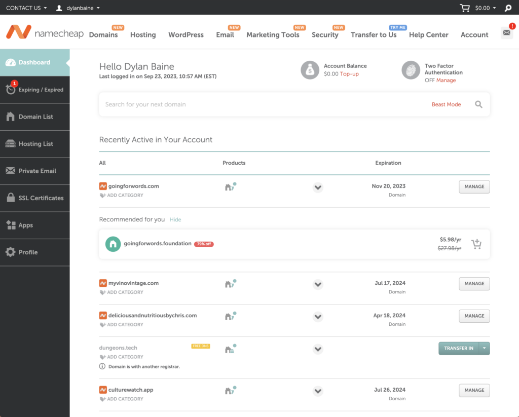 After logging in to your Namecheap account you will be directed to your dashboard, which should look like this.
