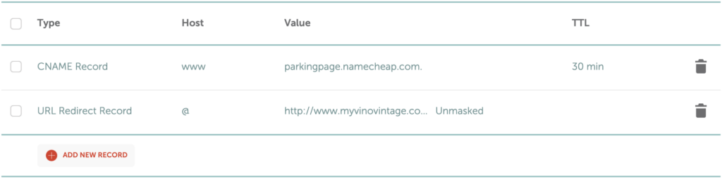 Now that the table is empty, you need to add your custom DNS rules. To do this, you should click the “ADD NEW RECORD” button and select the “A Record” for the “Type” field. Next, you want to put an @ sign in the “Host” field, and your server I.P. address in the “Value” field. After you’ve done this, you’ll want to repeat the process but instead of putting “@” in the host field, put “www” in the host field.