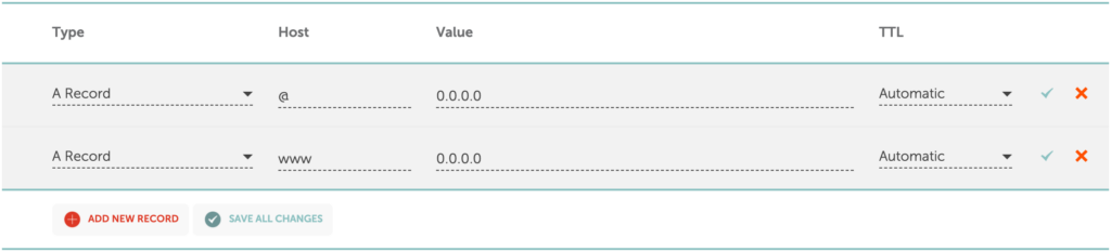 Your DNS records table should now look like this, but ensure that 0.0.0.0 is replaced with your servers I.P. address.
