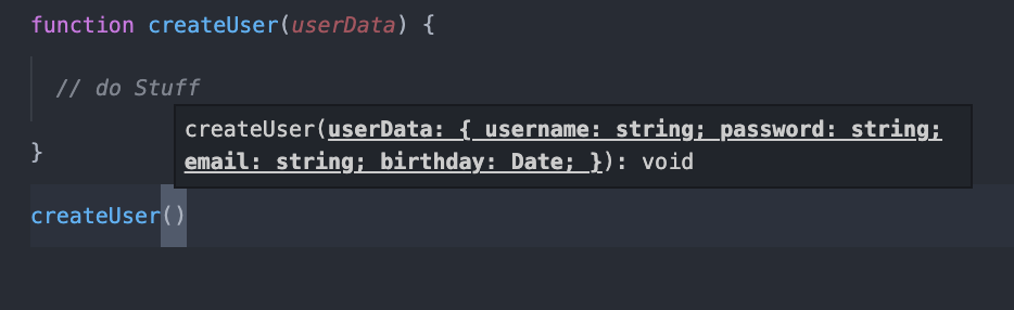 How do we pass along to the next developer that the userData parameter is an object that requires a username, password, email, and birthday? Enter JSDoc to the rescue! JSDoc is a specification for how to implement Docblocks in your JavaScript code. This is what code editors like VSCode follow when implementing JavaScript intellisense.